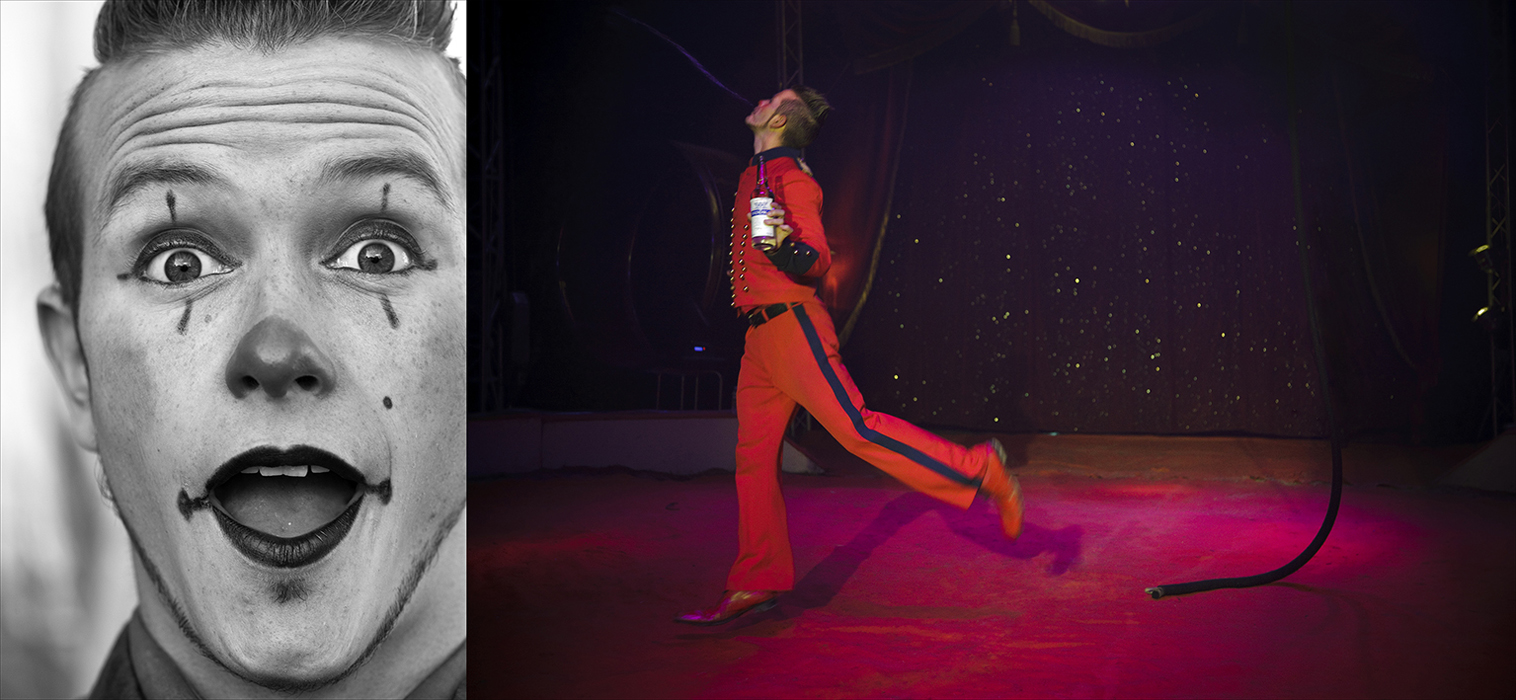 Lorsque j’ai aperçu le chapiteau rouge et jaune, j’ai tout de suite eu l’envie de rencontrer ces artistes, de les photographier pour réaliser une série de diptyques en noir et blanc et couleur.