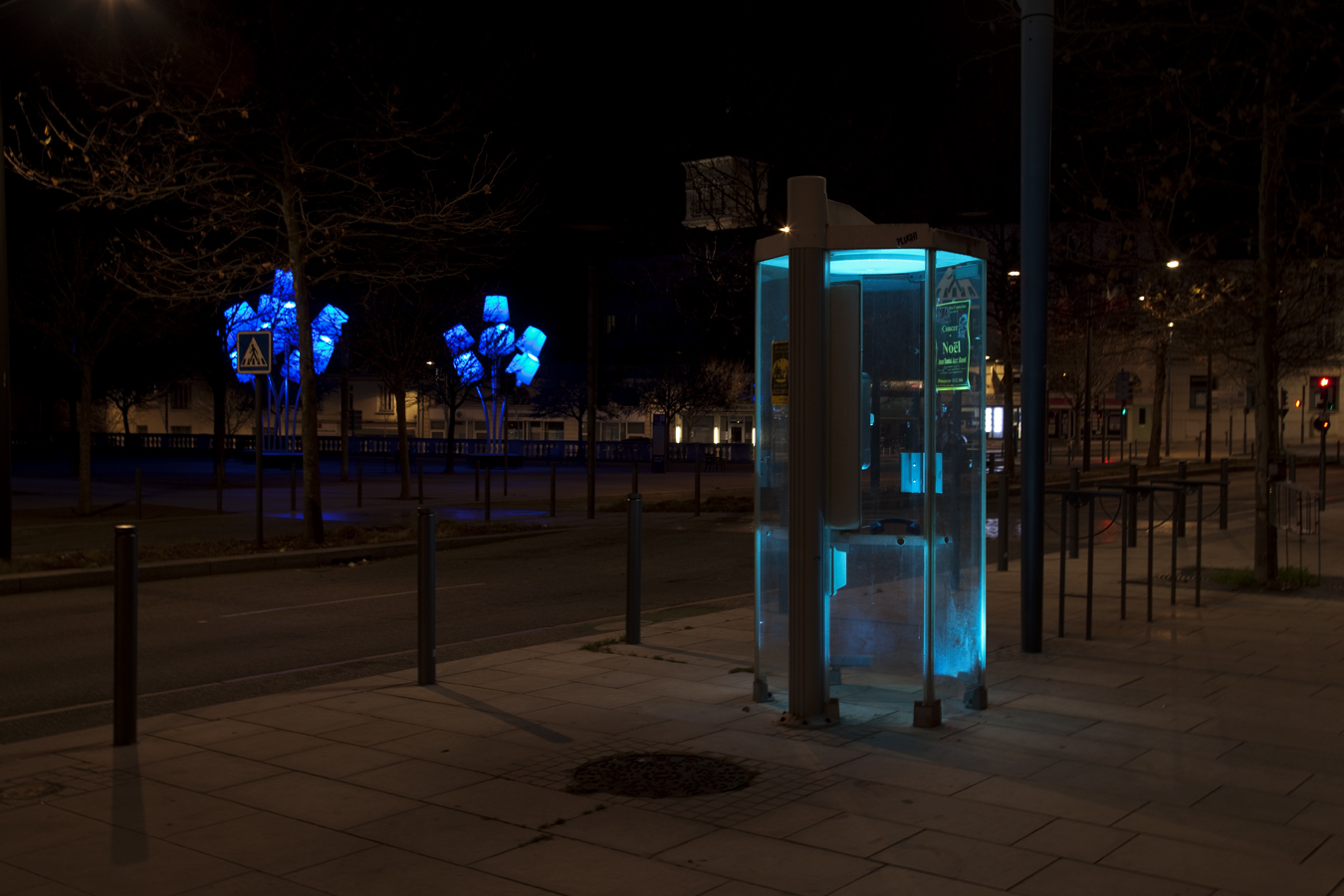 Le regard se promène dans des espaces quasi déshumanisés,quelquefois lunaires, pour finalement s’arrêter sur les cabines téléphoniques, qui, vêtues de cyan, comme en apesanteur, hors du temps, s’apprêtent à s’élever tels des corps célestes.