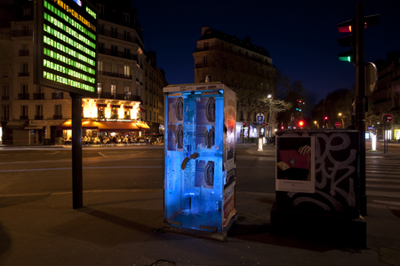 Ce travail photographique met en lumière l’édicule de verre cubique et nous confronte à une disparition qui marque la fin d’une époque. Les prises de vues nocturnes avec omniprésence du noir, symbole de mort, de deuil, font disparaître certains détails de la rue, du paysage, à la manière d’un clair obscur, tout en accentuant parfois d’autres signes de notre quotidien mis en relief par les couleurs chaudes des éclairages publics et des phares de voitures : architectures civiles et religieuses, signalétiques, bancs, barrières de trains, affiches…